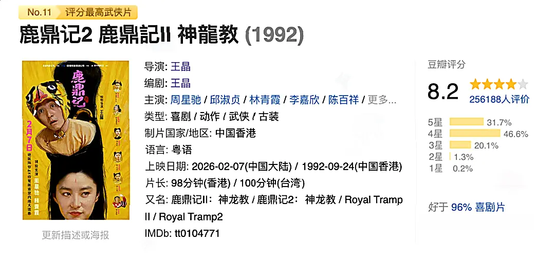 周星驰主演的《鹿鼎记2:神龙教》,空降定档2月7日重映。